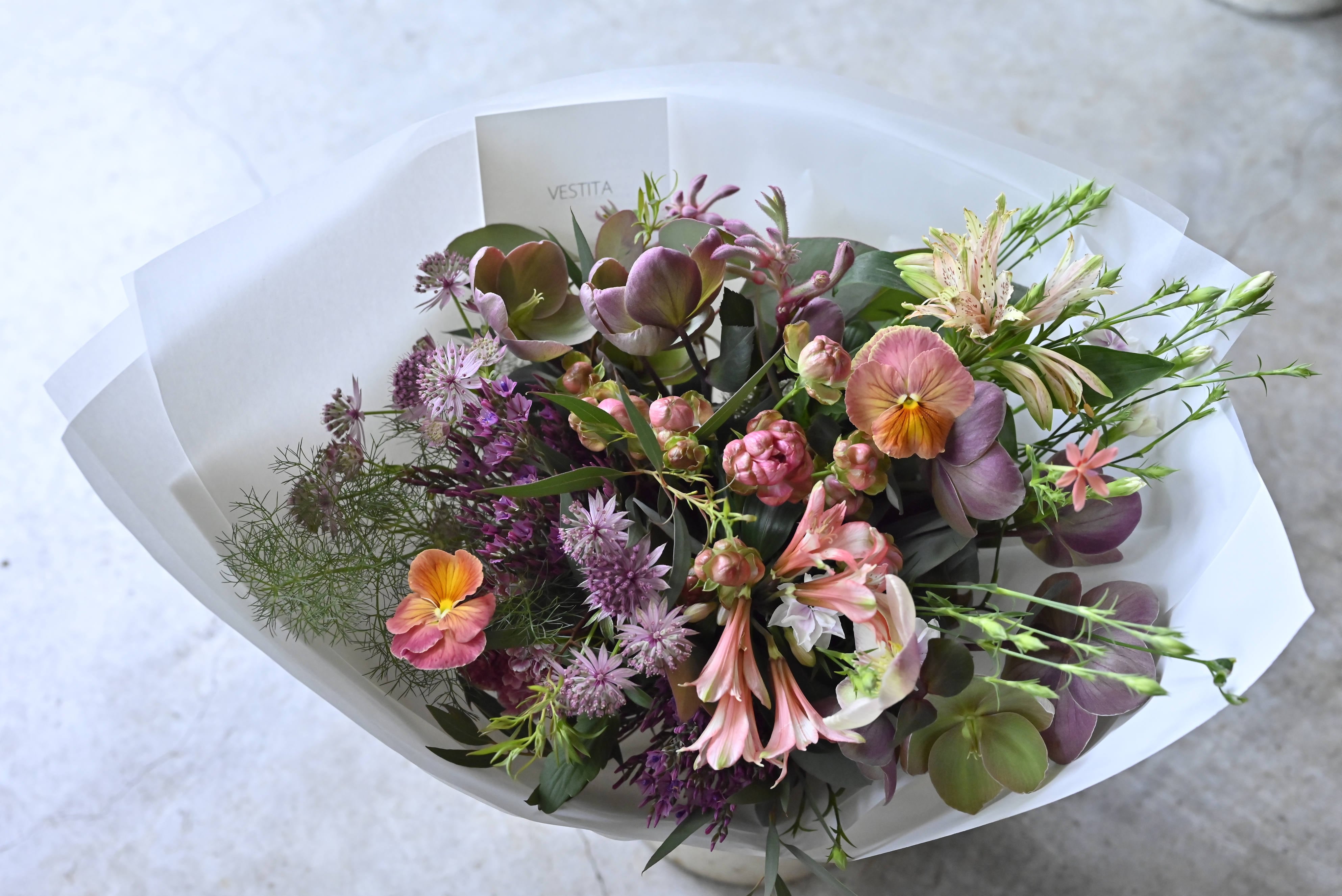 この季節の希少な花々が華やかな雰囲気を演出する特別なブーケです。お部屋を華やかに飾ることで、いつもの生活が一層豊かになりますよ。