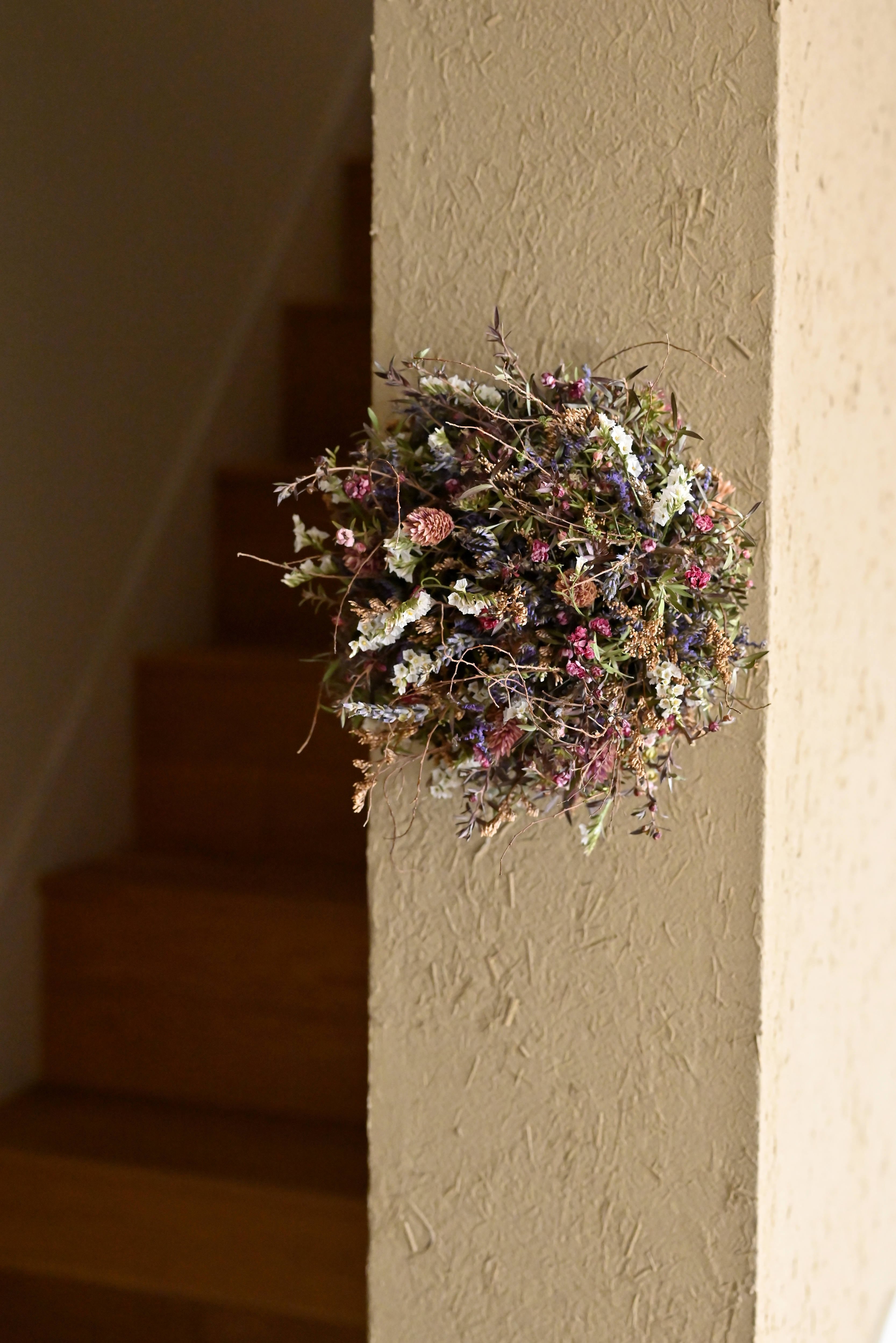 ドライフラワーで製作しておりますので、長期間飾っていただけます。